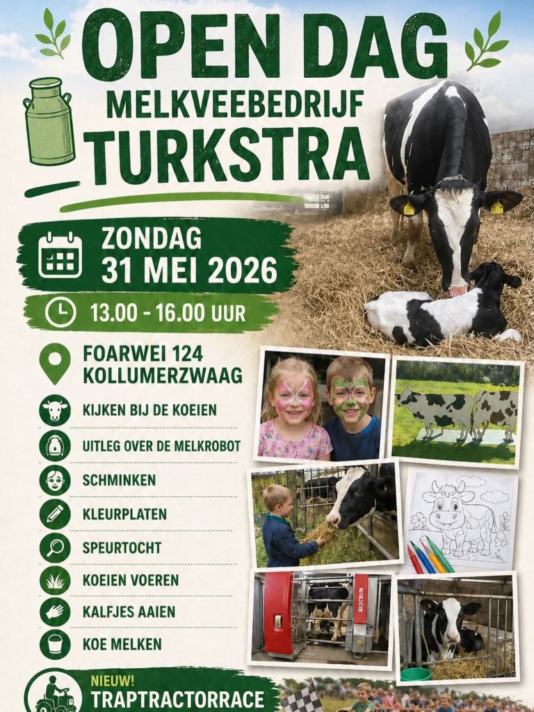 Zondag 31 mei 2026 organiseren we samen met studenten van MBO Aeres Buitenpost een open dag op ons melkveebedrijf.